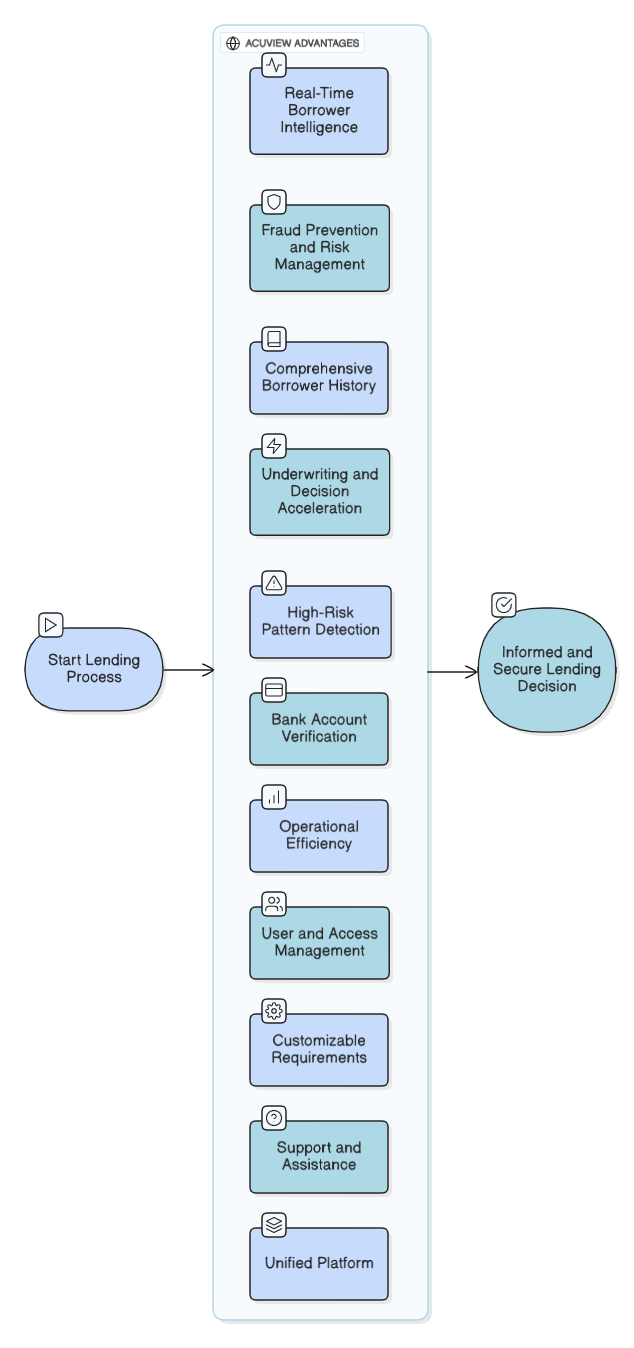 This guide gives you a brief walkthrough of the AcuView platform and explains how lenders use it to verify borrowers, review loan activity, and interpret borrower health insights. It provides a high-level understanding of AcuView’s features, verification scenarios, and underwriting flow, preparing users for the detailed screen-by-screen guidance in later sections.